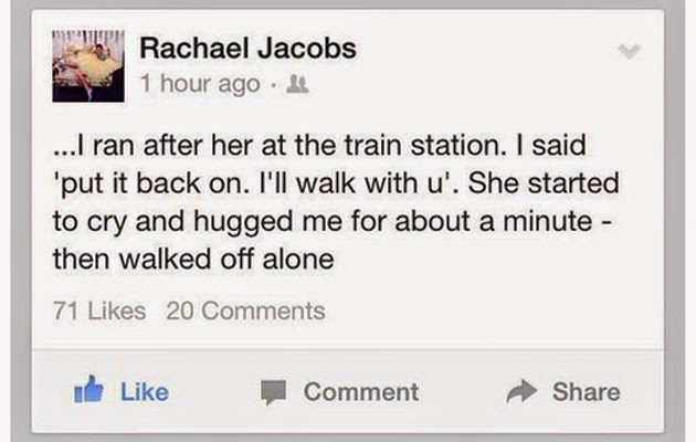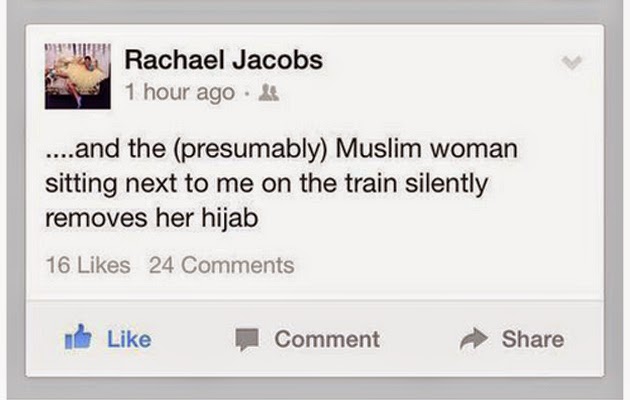 It began with a Facebook post by Rachael Jacobs about a Muslim woman on the train with her slowing removing her hijab for fear she might be attacked due to the incident taking place today.
