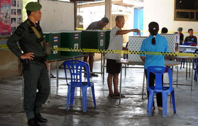 A police official keeps a watch as a Thai voter casts his vote into the ballot box at the Taa Ta Kho village polling station. --AFP PHOTO/Manjunath KIRAN