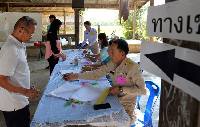 A Thai voter registers his name with an election official priot to casting his vote at the Taa Ta Kho village polling station. --AFP PHOTO / Manjunath KIRAN