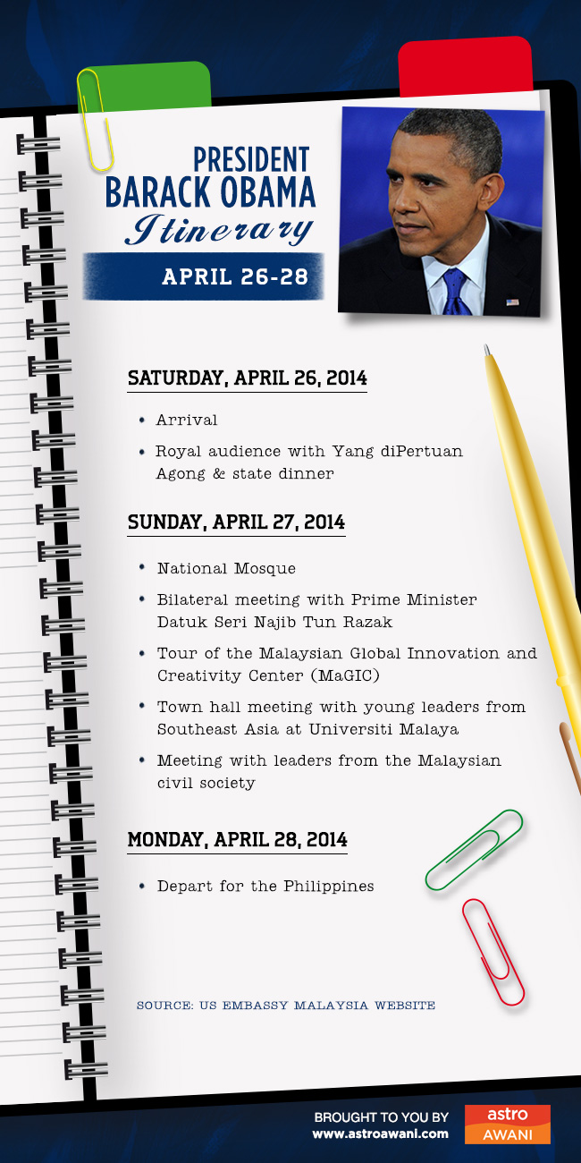 United States President Barack Obama is currently on a four-nation Asian tour that encompasses Japan, South Korea, the Philippines and Malaysia. Obama will arrive in Malaysia on Saturday for a three-day visit.