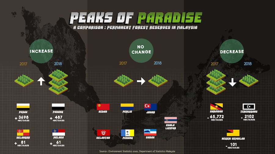 A 2017 and 2018 comparison looking at the areas in hectares of the permanent forest reserves in Malaysia. Photo: Matt La Brooy