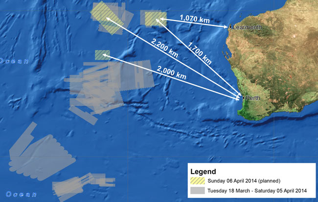 New search area for the missing flight MH370 released by AMSA on April 6, 2014.Houston said the Australian vessel Ocean Shield would be delayed while it investigated a separate acoustic signal in its current search location that had only been detected in the last hour.