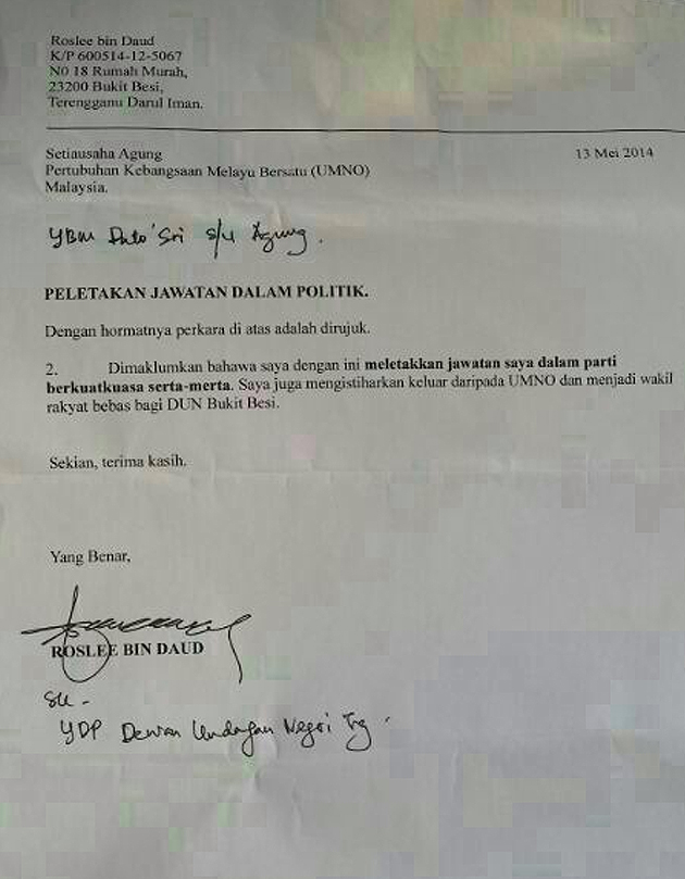 Roslee's letter was addressed to UMNO secretary-general Datuk Seri Tengku Adnan Tengku Mansor and was courtesy copied to the State Assembly Speaker.