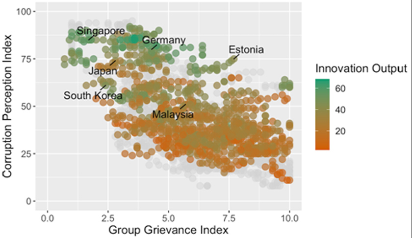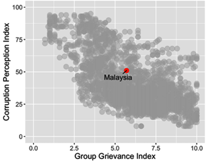 The figure below plots the Corruption Perception Index against the Group Grievance Index worldwide over the past ten years.