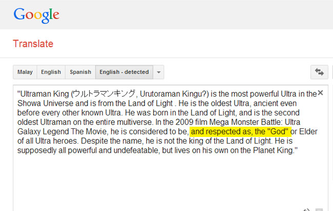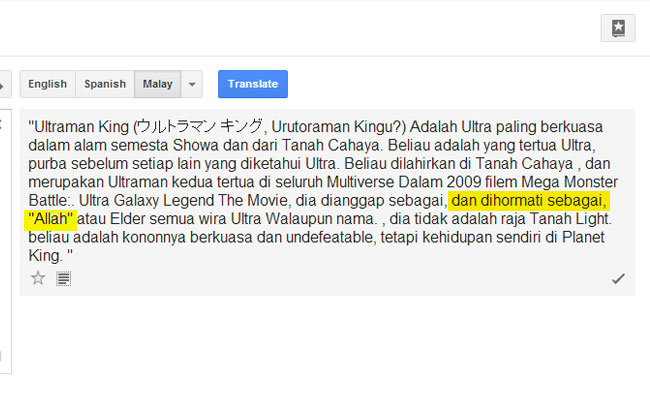 It was then translated to: "Dalam 2009 filem Mega Monster Battle: Ultra Galaxy Legend The Movie, dia dianggap sebagai, dan dihormati sebagai, "Allah" atau Elder semua wira Ultra."