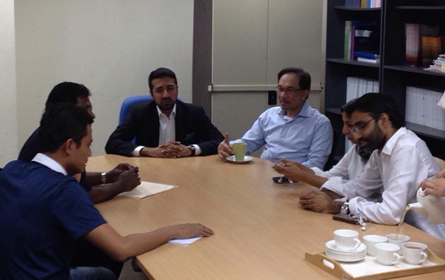 Anwar being questioned by police at the KEADILAN headquarters over a speech he gave in 2011. – Photo from Anwar’s Twitter page