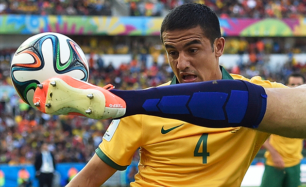 Australia's Tim Cahill, left, watches as Netherlands' Ron Vlaar clears the ball during the group B World Cup football match between Australia and the Netherlands. -AP Photo/Martin Meissner