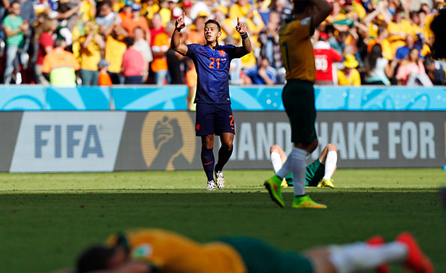 Netherlands' Memphis Depay celebrates his team's 3-2 victory over Australia during the group B World Cup football match between Australia and the Netherlands. -AP Photo/Jon Super