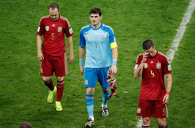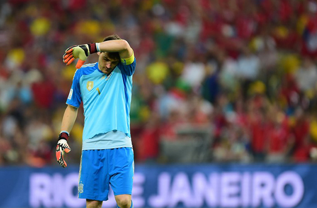 Spain's goalkeeper Iker Casillas leave the pitch after the group B World Cup football match between Spain and Chile at the Maracana Stadium. -AP Photo/Christophe Ena